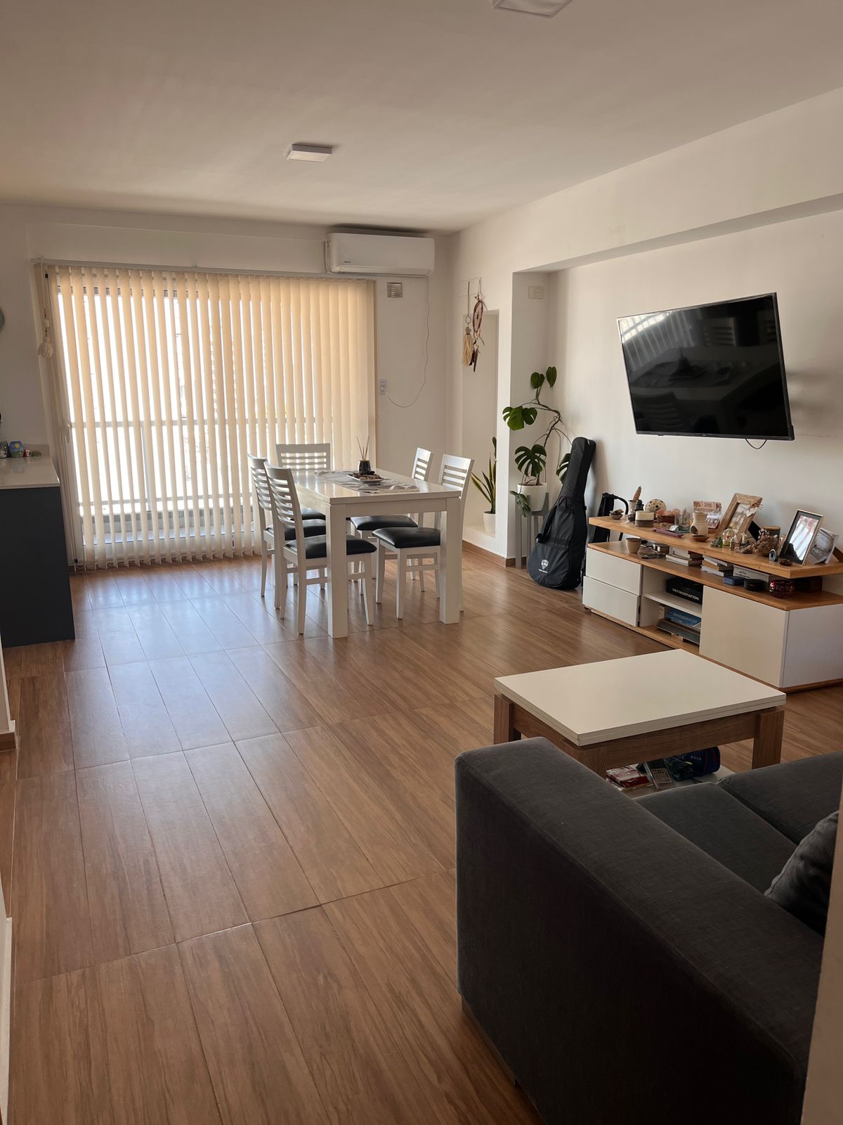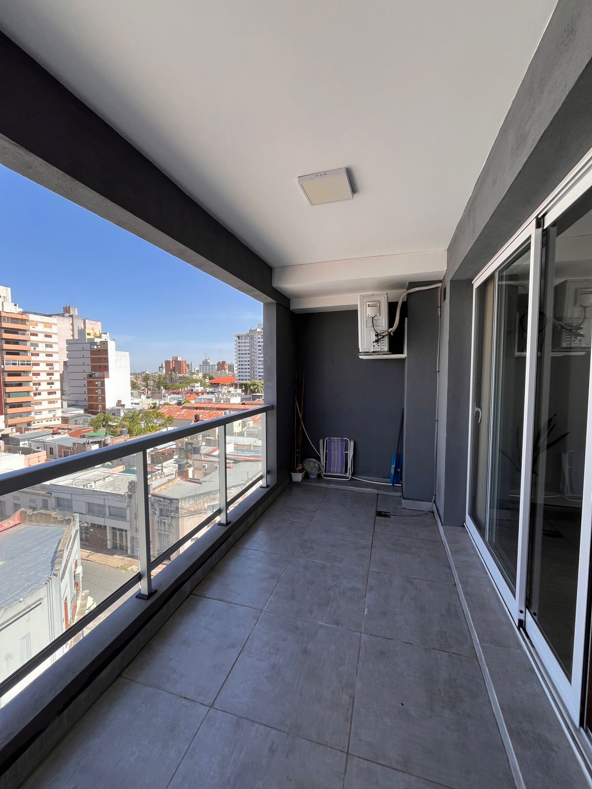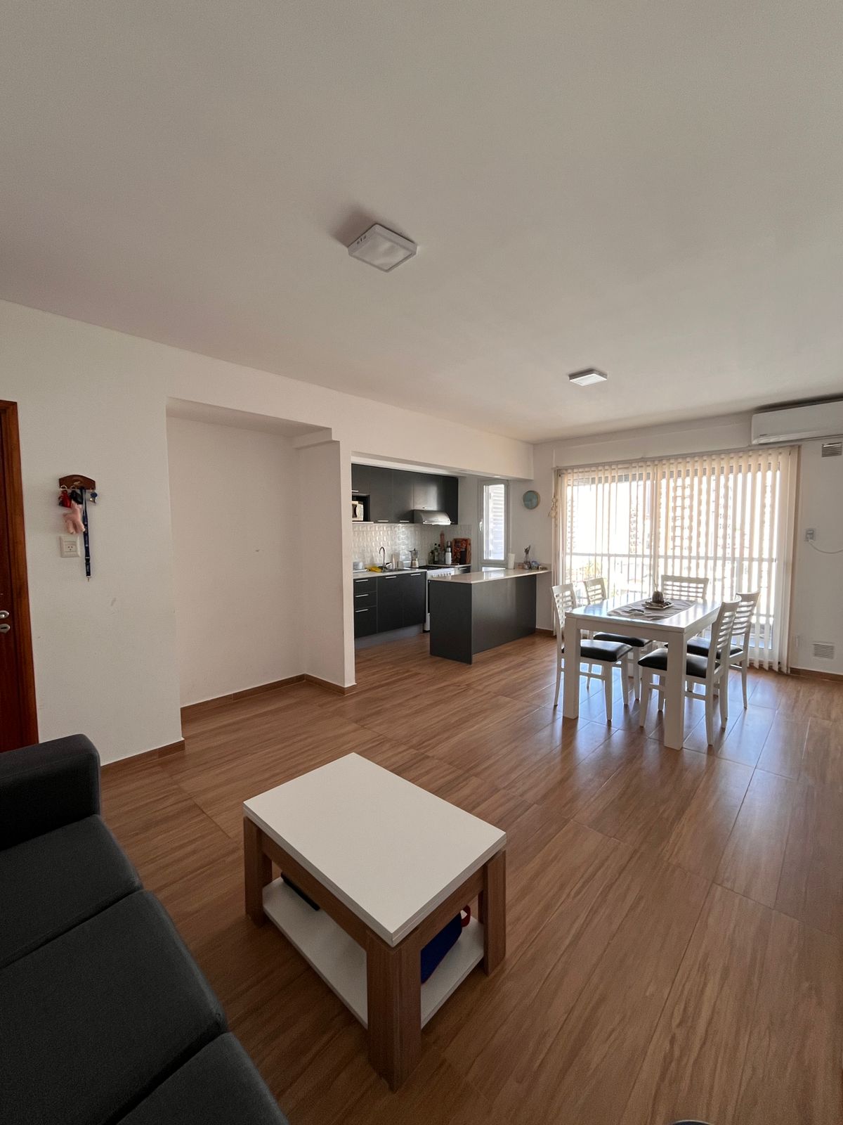 Posee pisos de porcelanato, cocina equipada, mesadas de Silestone, equipos de aire acondicionado instalados y cortinas verticales.