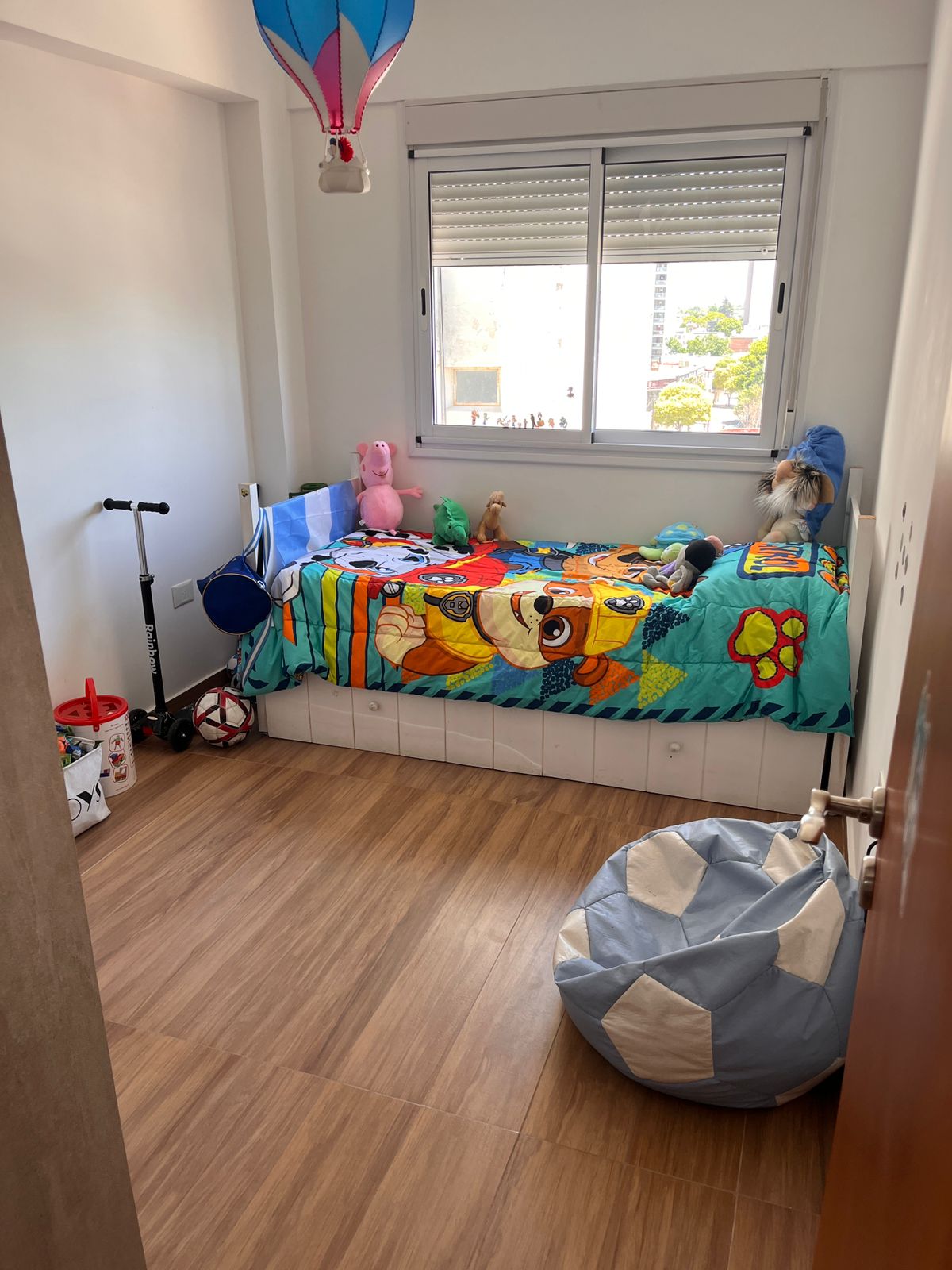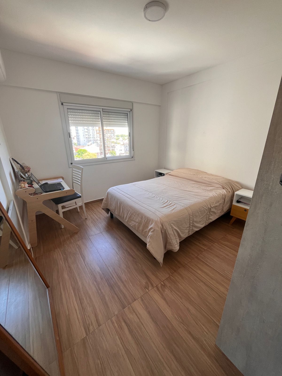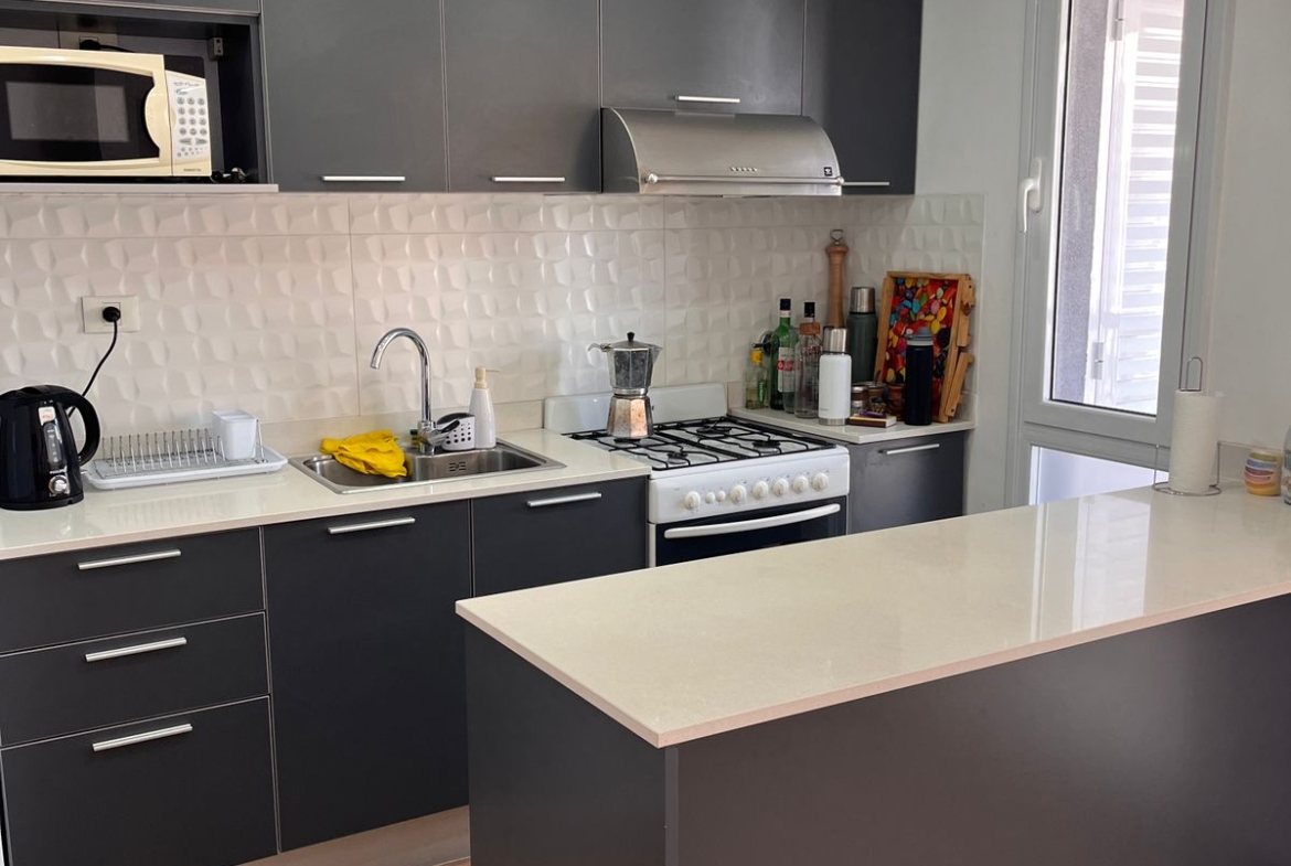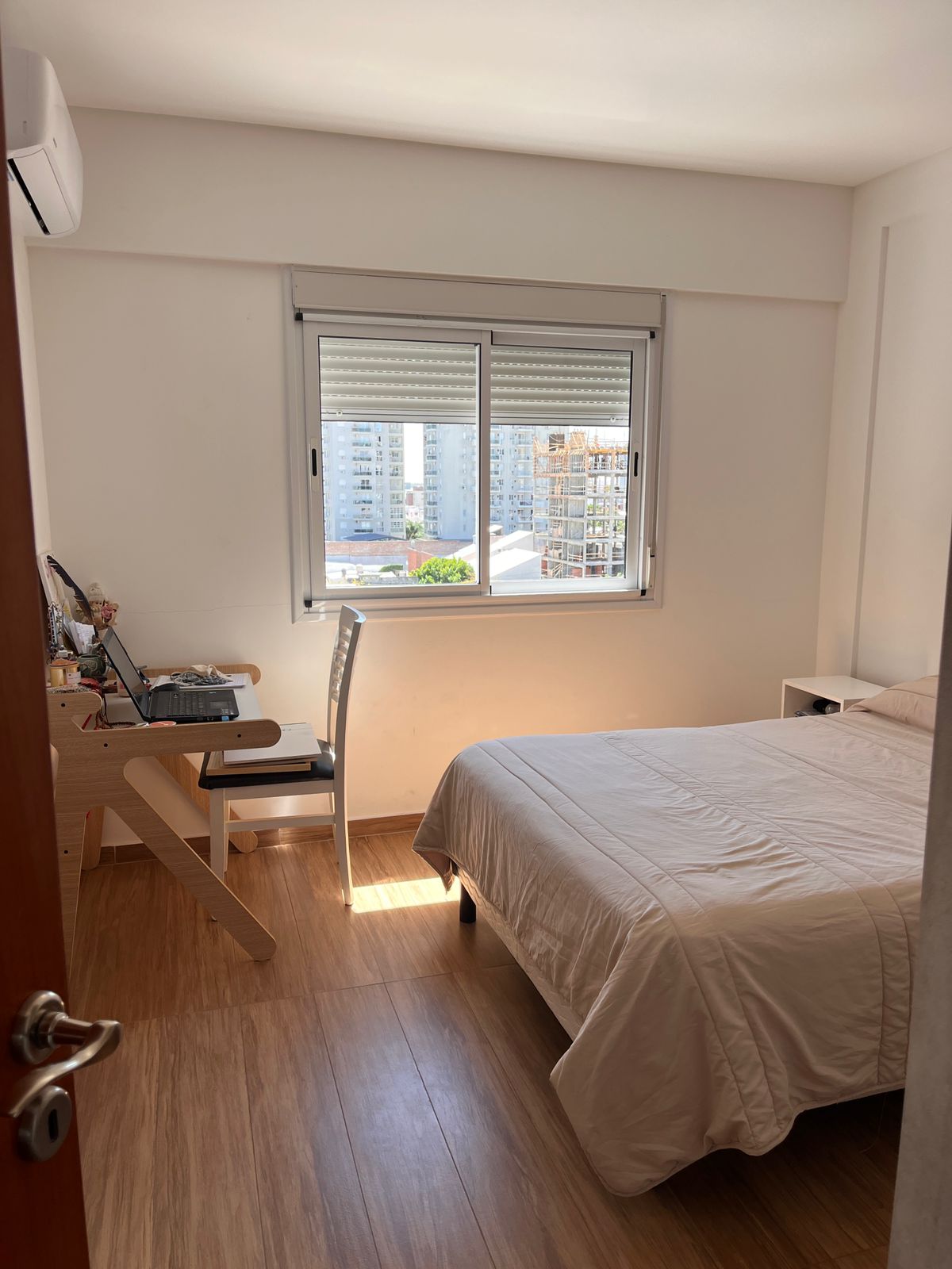 Posee pisos de porcelanato, cocina equipada, mesadas de Silestone, equipos de aire acondicionado instalados y cortinas verticales.