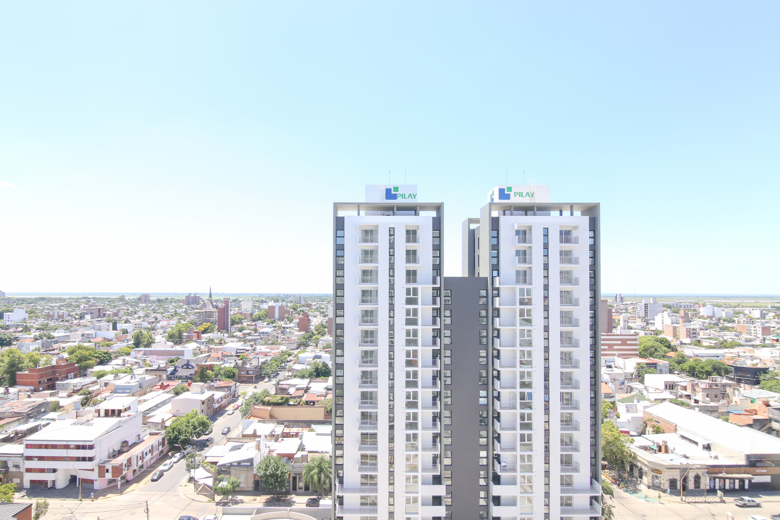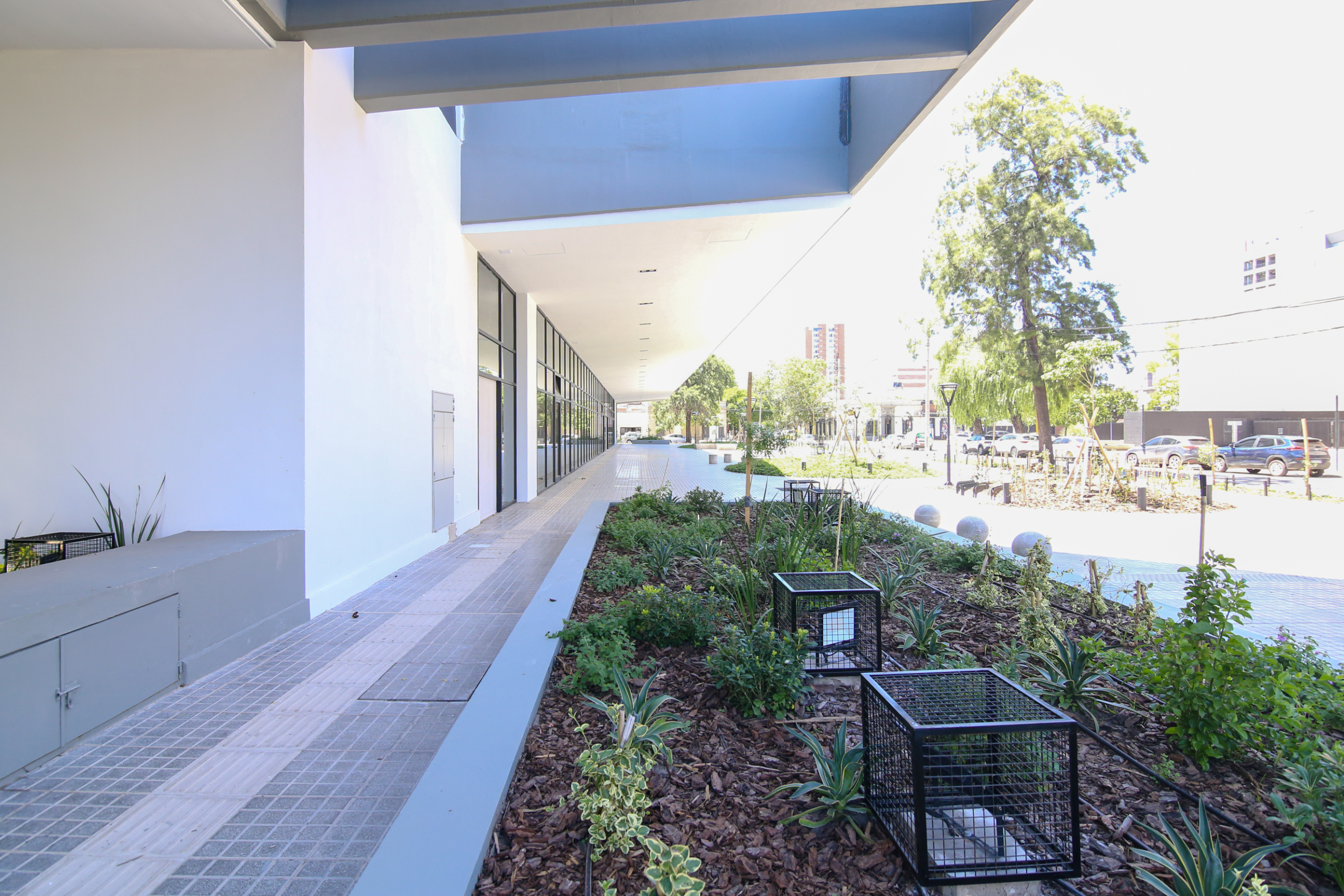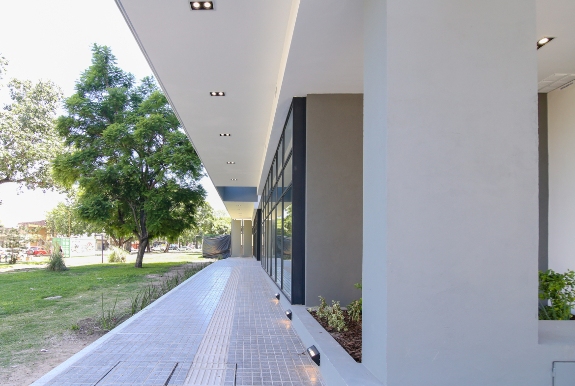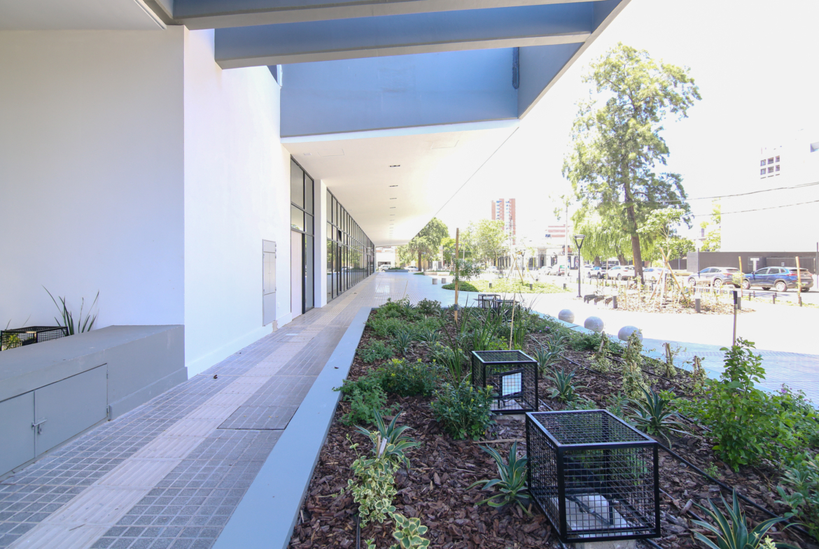 El complejo cuenta con una plaza central elevada, de uso exclusivo para residentes y locales comerciales, aportando un espacio verde único en altura que jerarquiza el conjunto.